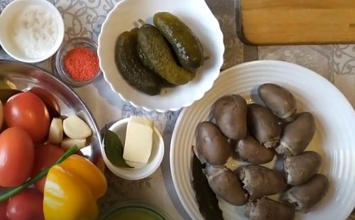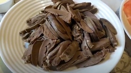 Відваріть субпродукти в воді, додавши лаврушку, перець горошком, сіль. Час варіння – 50-60 хвилин. Після відкиньте, дочекайтеся, поки стече відвар.