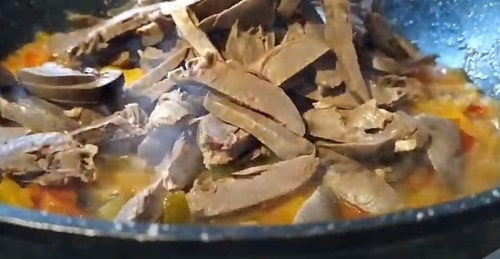 - Помийте субпродукти, наріжте шматочками, викладе до цибулі. Обсмажуйте, поки сердечка не стануть майже готовими. Перекладіть на тарілку.