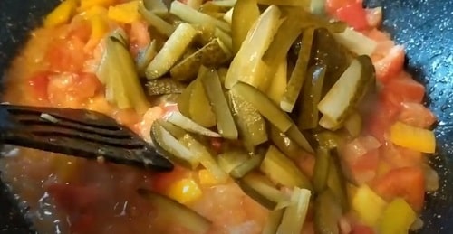 Викладіть огірки, перемішайте, продовжуйте смажити ще пару хвилин.