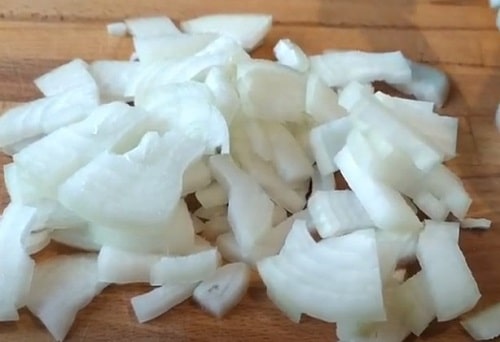 - Порубати цибулини великим кубиком, швидко обсмажте в олії до прозорості.