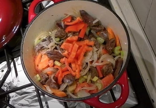 Викладіть до овочів нарізку сердечок. А при бульйон. Що залишився після варіння. Не зменшуючи вогню дочекайтеся закипання.