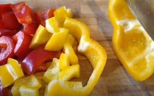 У болгарських перців виріжте насіння, настругати м'якоть шматочками, взявши по половинці овоча кожного кольору.