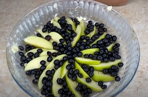Помийте плоди, наріжте звичайними часточками. Вистеліть дно форми, укладаючи довільно.