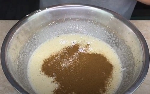 Додайте в миску сметану, засипте корицю і розпушувач. Гарненько перемішайте.
