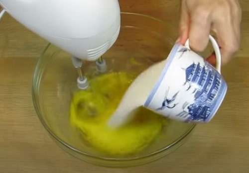 - Збийте яйця з цукром в пишну піну. Всипте ванілін, розпушувач, перемішайте.