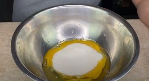 Для тіста шарлотки спочатку розбийте в миску яйце, підсипте цукор. Збивайте міксером до білизни.