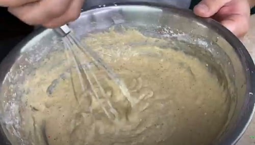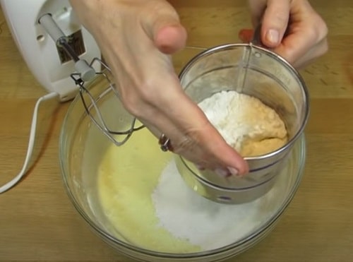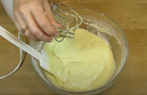 - У два прийому засипте борошно, збиваючи до однорідної маси без грудок.