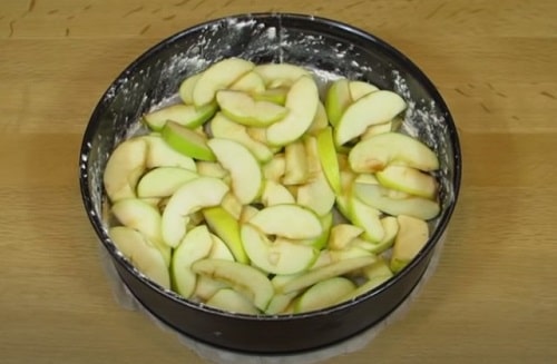 - Поріжте яблука тонкими часточками, накрийте денце форми в два ряди.