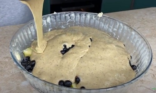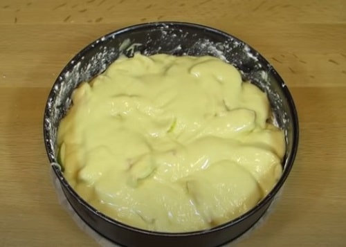 - Вилийте яблучне тісто на промаслений сковороду або форму.