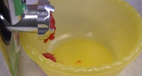 Помідори порізати аналогічно болгарського перцю, але я раджу пропустити через м’ясорубку або попрацювати блендером.