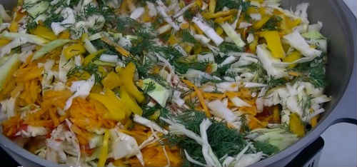 Всі підготовлені овочі складіть у велику каструлю або казан. Перемішайте вміст.