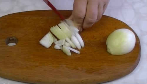 Поріжте цибулю. Тут раджу зробити дрібні кубики, придатні для обжарювання.