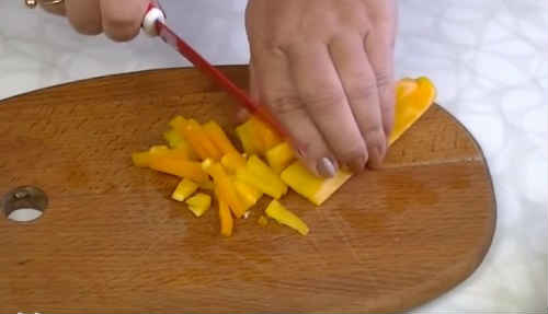 У перців видалити насінну коробку, м’якоть покришіть кубиками або соломкою.