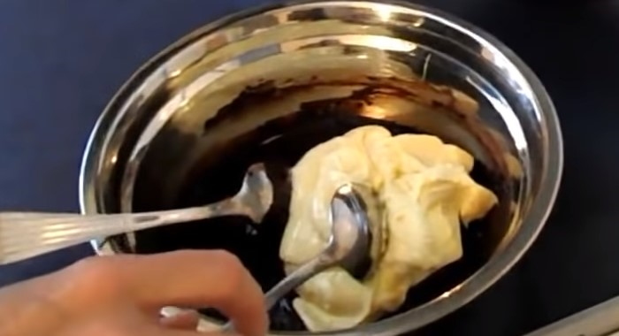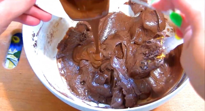 2. Шоколад, розтоплений на водяній бані або в мікрохвильовій печі, вливаємо в ароматну масляний суміш і ретельно вимішуємо інгредієнти до їх повного з’єднання між собою.