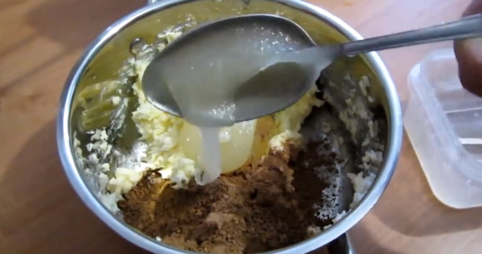 2. Потім злегка збиваємо м’яку масляний субстанцію, додаємо туди мед і какао. На малих оборотах міксера доводимо суміш до однорідності.