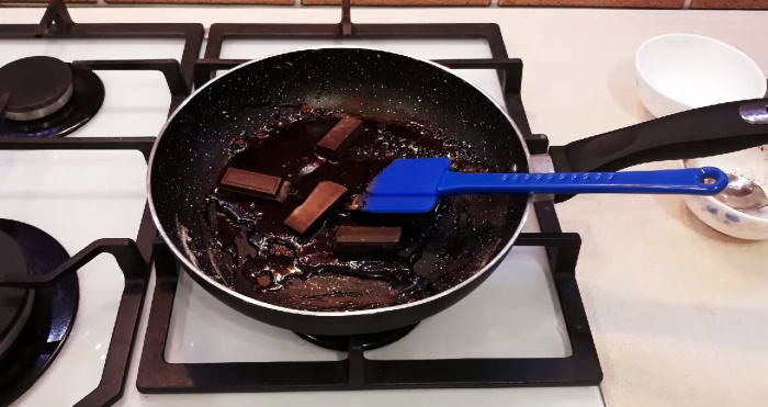 2. Потім додаємо шоколад і, не перестаючи розмішувати, чекаємо, поки плитка розтане і з’єднається з іншими інгредієнтами. Після отримання в’язкої шоколадної маси газ відключаємо.