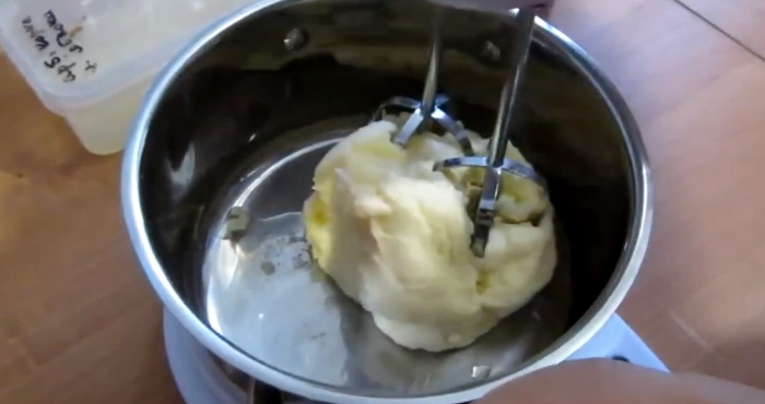 Відокремлену рідина по ходу збивання необхідно акуратно зливати в миску.