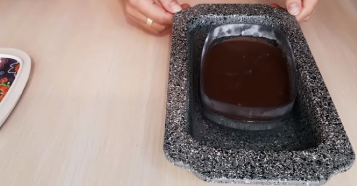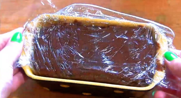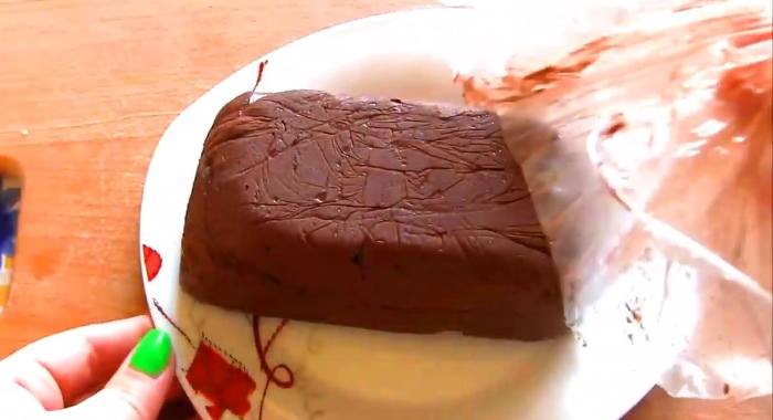 3. Готову масу шоколадного кольору розкладаємо по відповідним формах, на дно яких вистелена харчова плівка. Верх ласощі розрівнюємо, прикривають плівкою і прибираємо в холодильну камеру до застигання.
