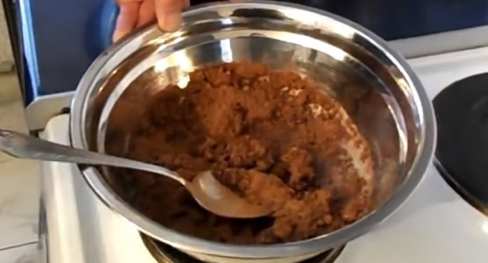 1. На маленьке полум’я варильної поверхні ставимо сковороду з антипригарним покриттям, насипаємо в неї пудру і какао, наливаємо молоко і при постійному перемішуванні доводимо масу до однорідного стану.