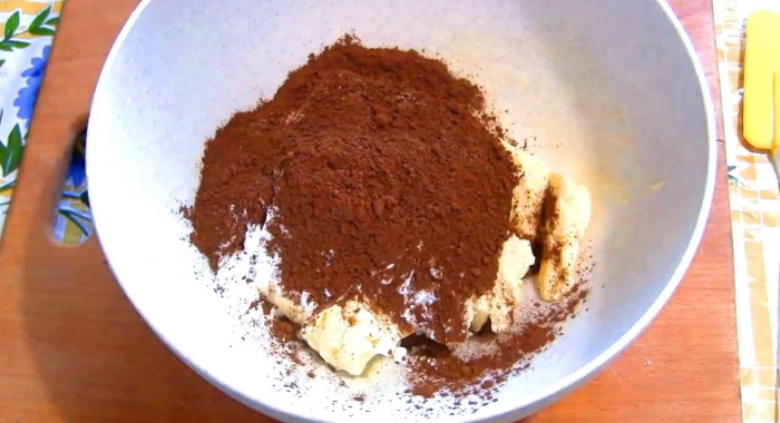 1. Розм’якшене масло збиваємо до однорідності з какао порошком, ванільним цукром і цукровою пудрою. Зробити це можна міксером, які працюють на малих обертах або звичайною лопаткою.