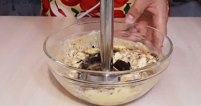 3. М’яке вершкове масло перекладаємо в миску, додаємо в нього шоколадну суміш і збиваємо до однорідності за допомогою заглибного блендера.