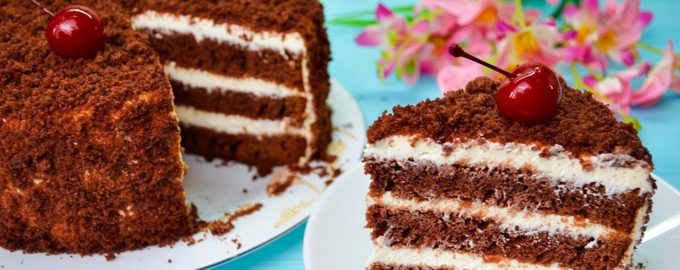 Простий шоколадно-кошторисний торт з приємною вишневою кислинкою, повітряним кремом і пористою основою – красивий десерт, який вийде навіть у початківця господині.