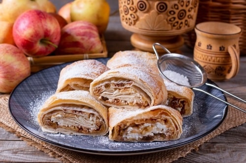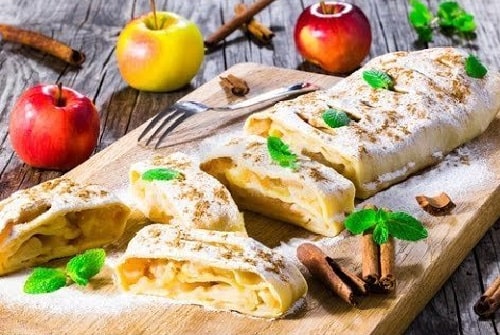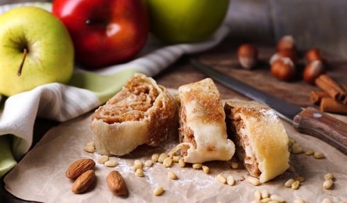 Яблучний шрудель порадує вас хрусткою скоринкою, ароматною і соковитою начинкою. А худнуть відзначать низьку калорійність ласощі. Якщо вам вже набридла проста начинка з яблуками, додайте сухофрукти, горіхи, будь-які ягоди і фрукти, мак, кокосову стружку, банан, корицю.