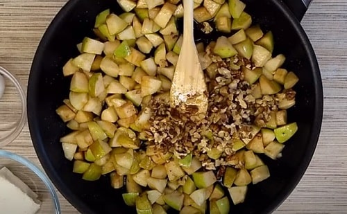Засипте їх на сковороду, перемішайте. Заодно посипте начинку корицею. Готуйте, поки яблука не стануть м'якими. Чи не передержіте, щоб кубики не розвалилися, у деяких сортів яблук це відбувається досить швидко.
