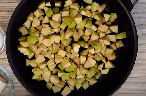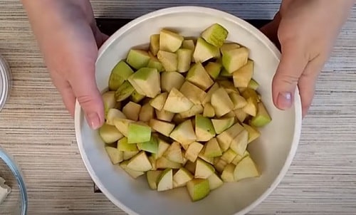- Покришите яблука невеликими кубиками (шкірку обов'язково зріжте).
