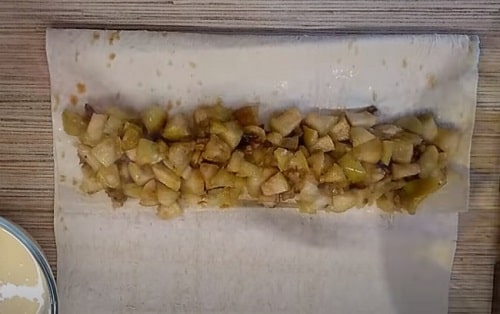 - Розкладіть пласт лаваша, рівномірно розподіліть начинку.