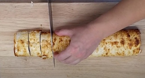 - Акуратно загорніть в рулет. Наріжте гострим ножем на шматочки.