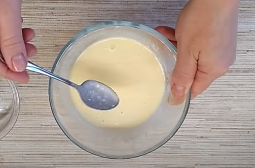 Зробіть просочення для лаваша. Для цього викладіть в миску сир, розбийте яйце, підсипте ложечку цукру, влийте молоко. Збийте вінчиком суміш, вона повинна вийти рідкою. Кількість молока відрегулюйте самі.