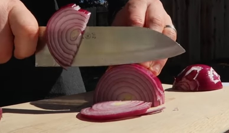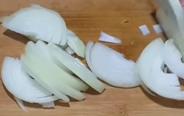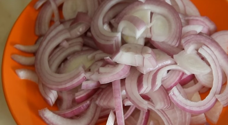 2. Цибулю необхідно почистити і нарізати великими півкільцями.