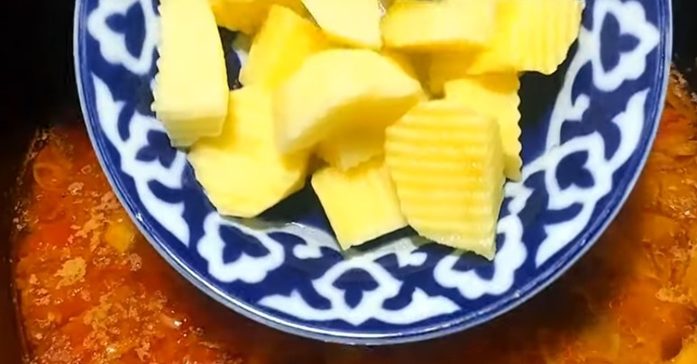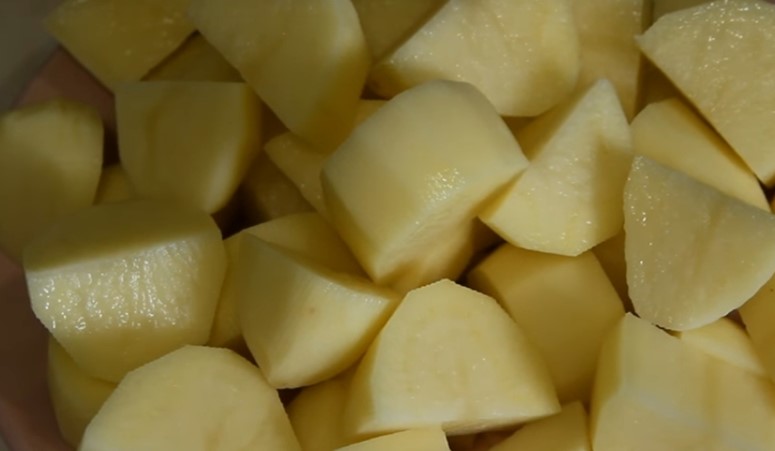 5. Останньою в казан засипається крупно нарізану картоплю, додаються сіль і спеції, перемішують і накривається кришкою. Вогонь зменшується до слабкого, страви необхідно нудитися близько 65 хвилин.