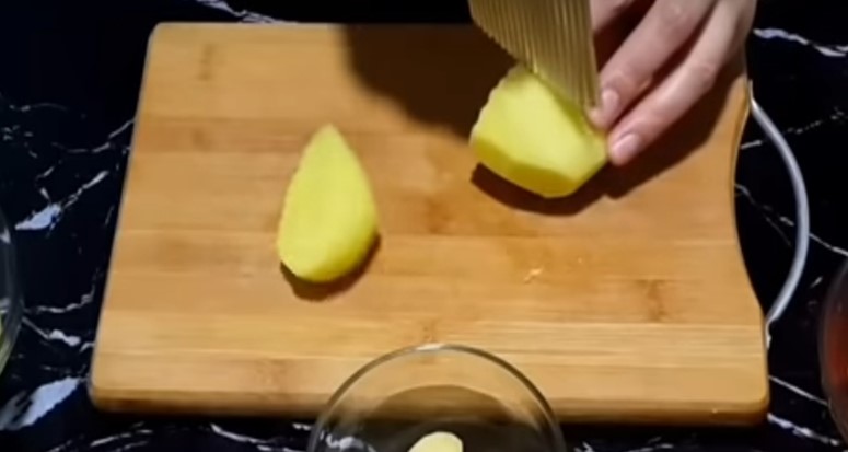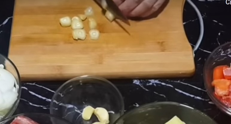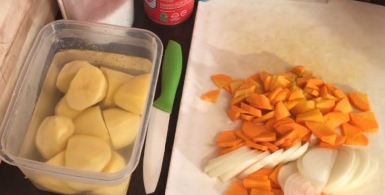 2. За цей час необхідно дуже крупно нарізати картоплю, цибулю на півкільця і моркву на великі кубики.