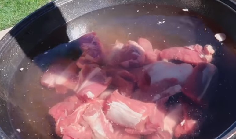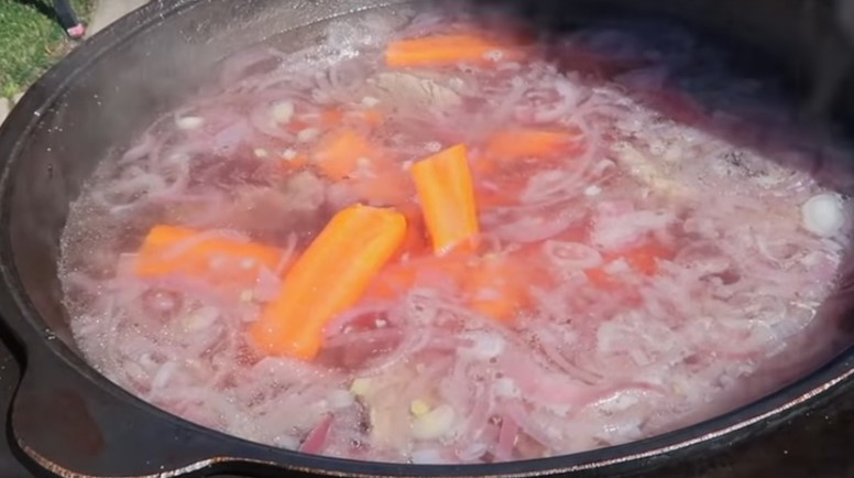 1. У казан наливається вода, і закладається крупно нарізане м’ясо, додається сіль і спеції, які були обрані для страви.