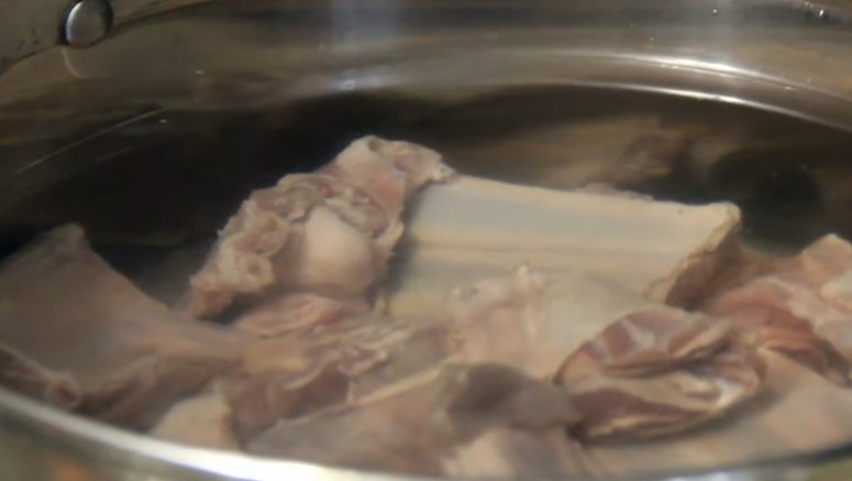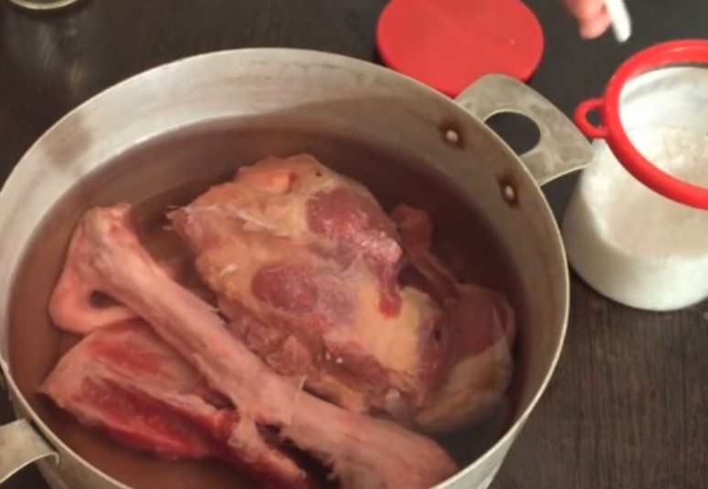 1. У глибоку каструлю вливається вода, опускається м’ясо і додається сіль і спеції. Каструля відправляється на вогонь, після закипання знімається піна, слід варити м’ясо близько 55 хвилин.