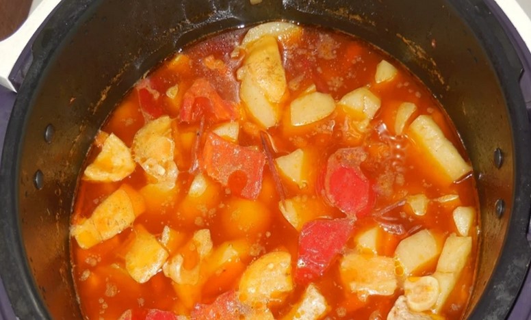 3. Тепер в келих необхідно покласти крупно нарізаний помідор і картоплі, залити воду. Додати сіль і спеції, перевести в режим «Суп» і тушкувати 40 хвилин під закритою кришкою.