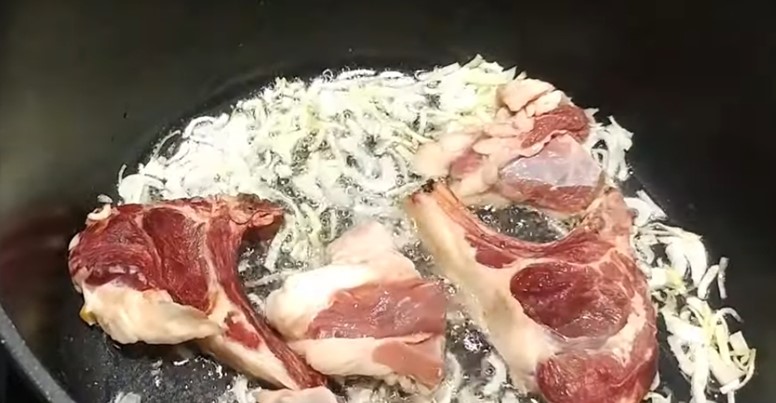 1. У казан наливають масло, додається дрібно нашатковану цибулю і великі шматки баранини, обсмажувати потрібно 7 хвилин.