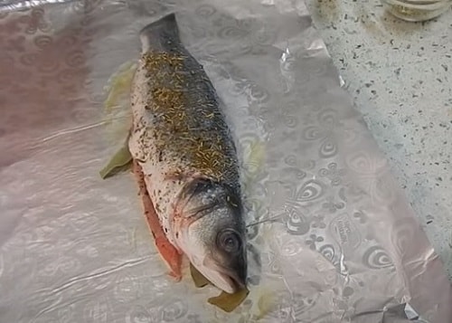 - Підготуйте тушку сибаса до запікання (почистіть, видаліть зайве, як розказано в рецептах вище).