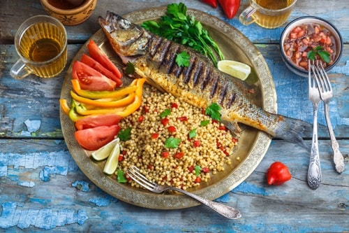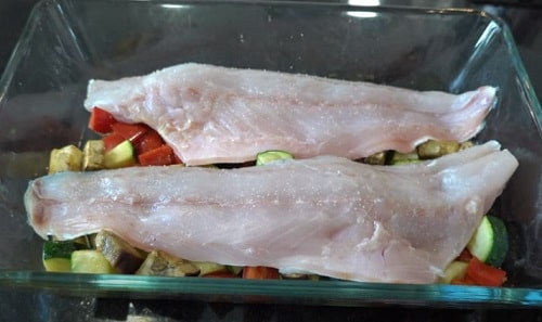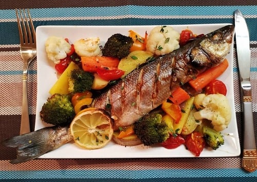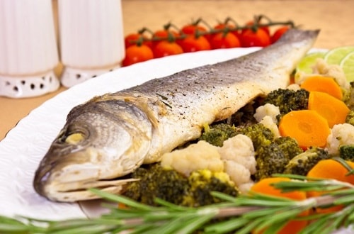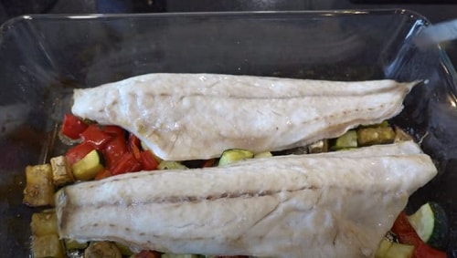 Сібас, запечений в духовці з овочами