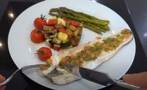 Саме блюдо досить просте – рибка, велика кількість овочів. Родзинкою стане чудовий французький соус вьерж.