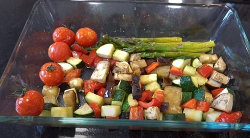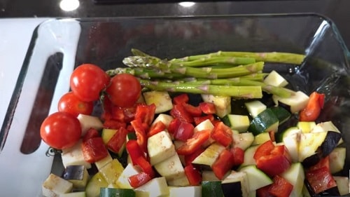 Підстелити на деко або у жароміцних форму пергамент, трохи промаслити його. Викладіть все овочі упереміш. Злегка окропити маслом оливи, підсолити.