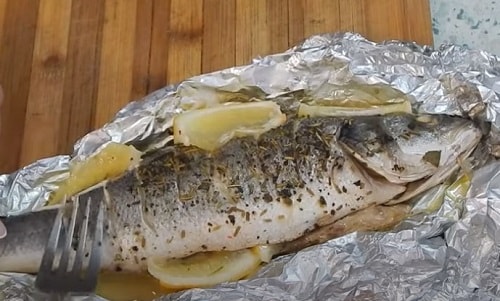Сібас, запечений у фользі цілком з лимоном