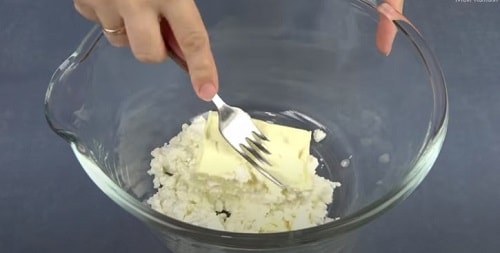 - Викладіть в миску сирний продукт, влийте масло. Розітріть суміш.