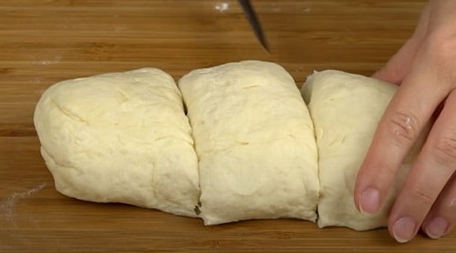 Охолоджене тісто скачайте в товсту ковбаску. Поділіть на три частини.