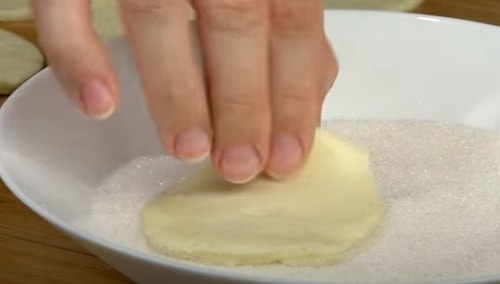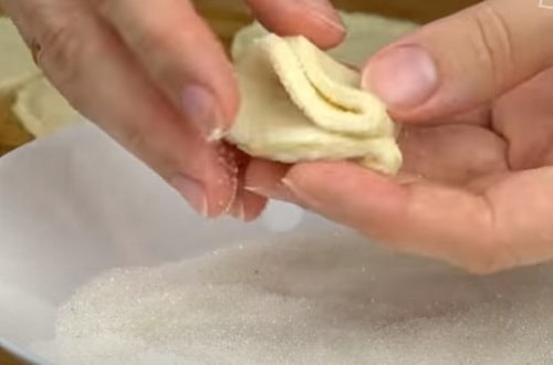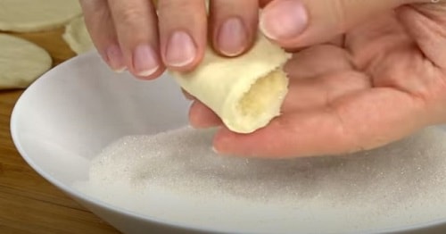 - Умочіть кругляшек в цукор, скрутіть солодкістю всередину. Ще раз умочіть в крупинки, і знову загорніть трикутником. Підсолоджувач повинен виявитися і на зовнішній стороні печива.