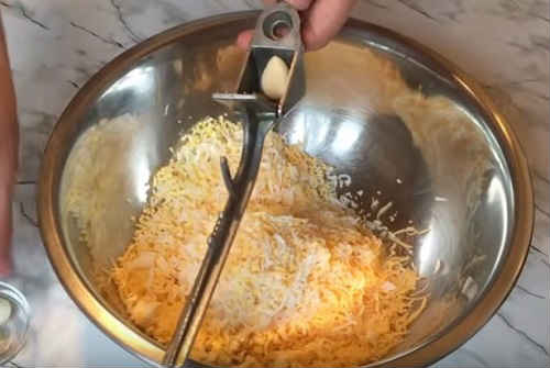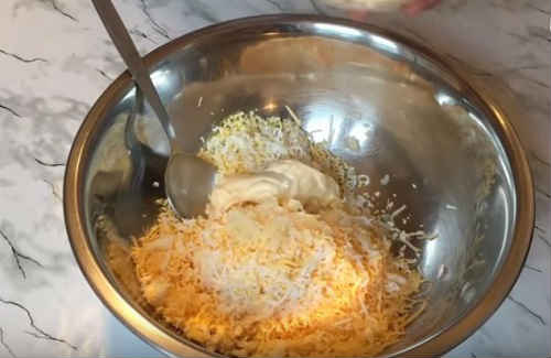 - Розітріть сир, додайте до нього інші підготовлені компоненти. Гарненько перемішайте масу.