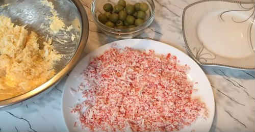 - Заздалегідь покладіть сирок в морозилку, тоді він натрется швидко і легко. Потім подрібніть в крихту. Аналогічно потріть палички, пересипте їх в сир.