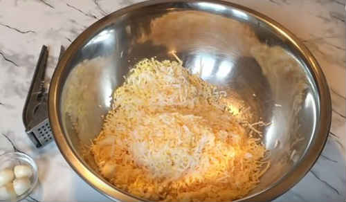 Аналогічно покришіть шматок сиру, складіть в миску, додайте яєчну крихту.